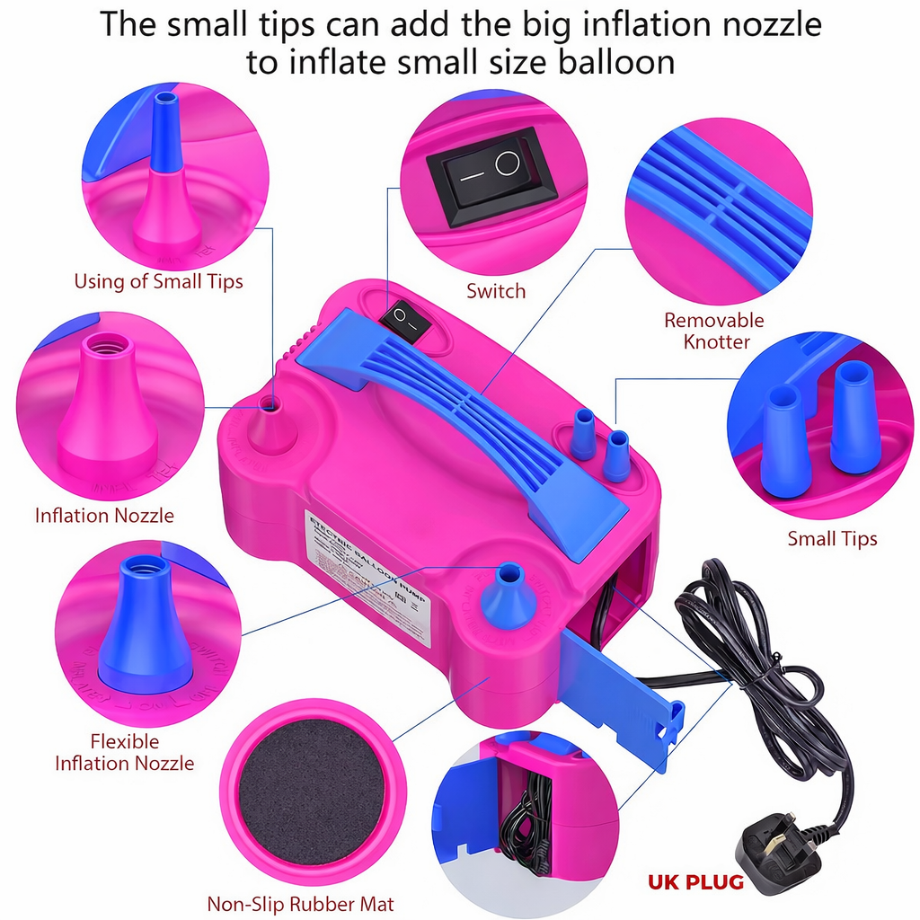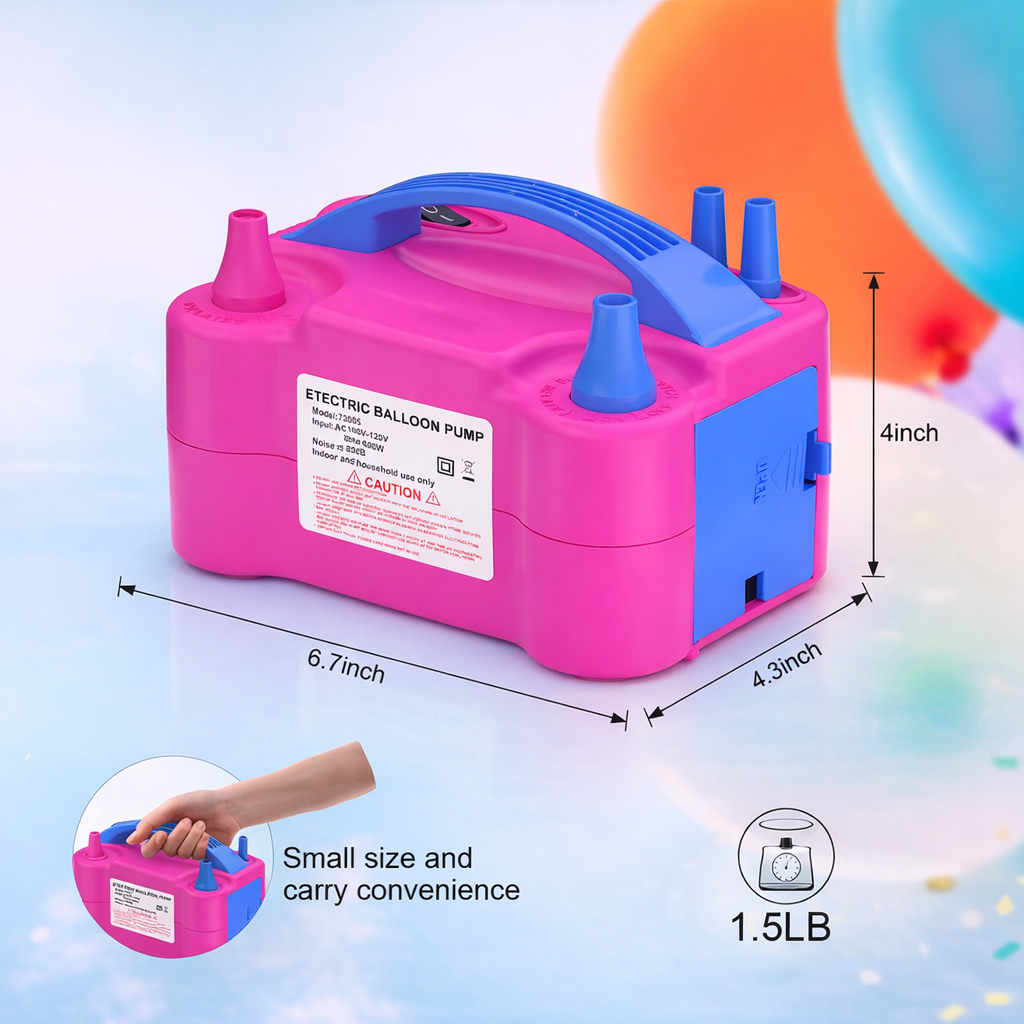 Totul devine extrem de simplu atunci cand ai ustensilele potrivite. Pompa electrica profesionala pentru umflat baloane cu 2 modalitati de umflare: in regim automat si manual, putere 600 W, functioneaza la 220V. Culoare roz&albastru. Doua capete pentru modificare orificul prindere balon.