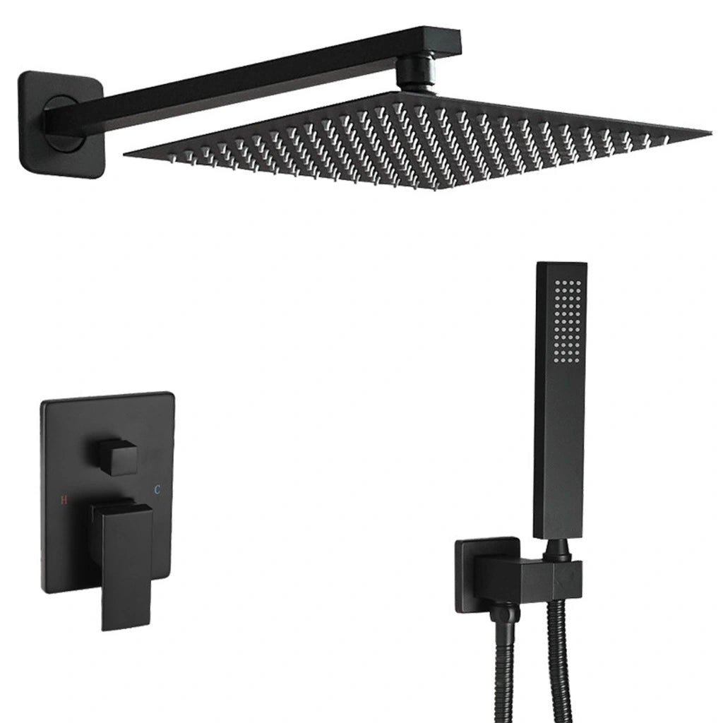 Sistem de Cadă-Duș negru mat, montaj pe perete, cap ploaie 10” și pară de duș, presiune înaltă