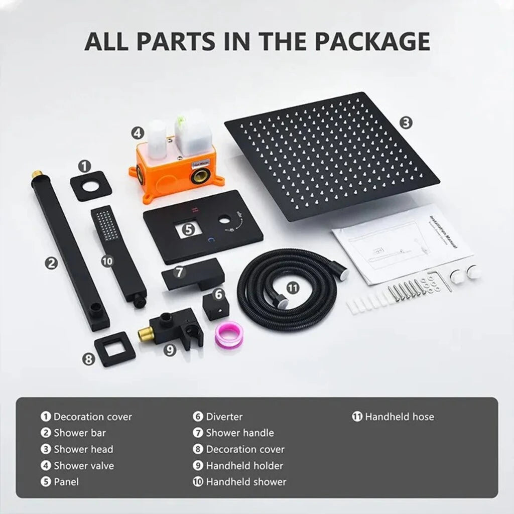 Construit din materiale premium – alamă solidă și oțel inoxidabil 304 – sistemul este rezistent la coroziune, rugină și uzură, fiind conceput pentru utilizare îndelungată. Finisajul negru mat nu doar impresionează vizual, ci este și ușor de întreținut.